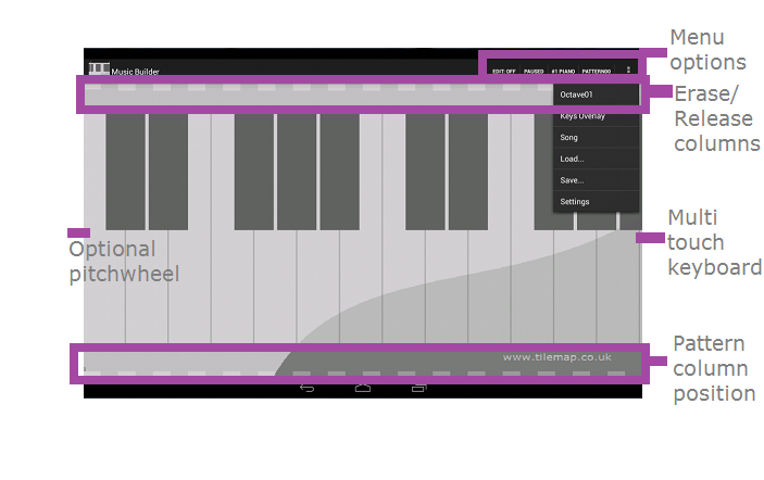 You can change which instrument is used for each part (1, 2 or 3), #4 Drums cannot be changed. You can replace the background picture by clicking Select... reset by clicking Default. This can look very good when you are playing back a song with no piano overlay. You can change how the sequencer display notes, traditional uses # notes on a stave. Instructions allows you to view this file. Visit tilemap.co.uk opens your browser with the latest info about this app, check for the latest news and whether new versions are available. Ok will save the changes and return to the editor.